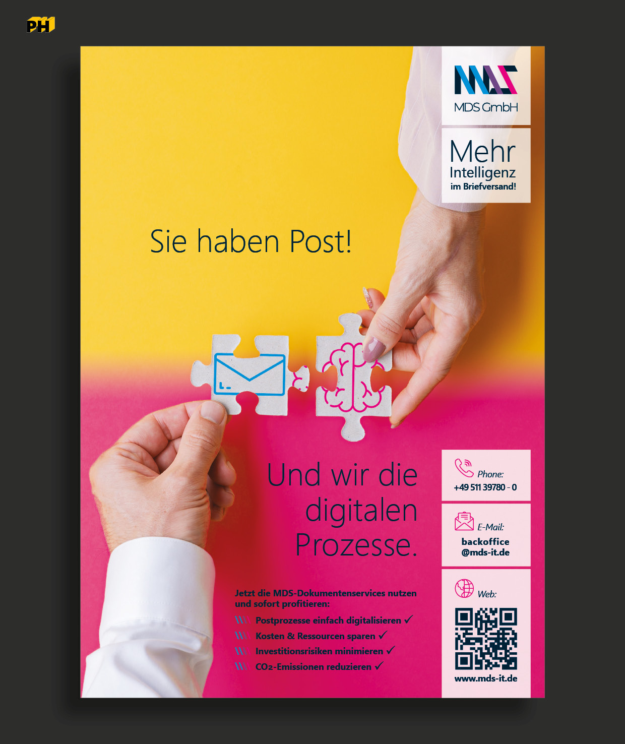 Entwicklung und Produktion der Online- & Print-Kampagne "Digitale Prozesse" für MDS GmbH, 2019. Indesign, Photoshop.